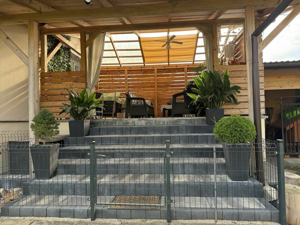 Na działce znajdują się rośliny i krzewy ozdobne, miejsce na ognisko i grill, a także drewniana szopa narzędziowa.